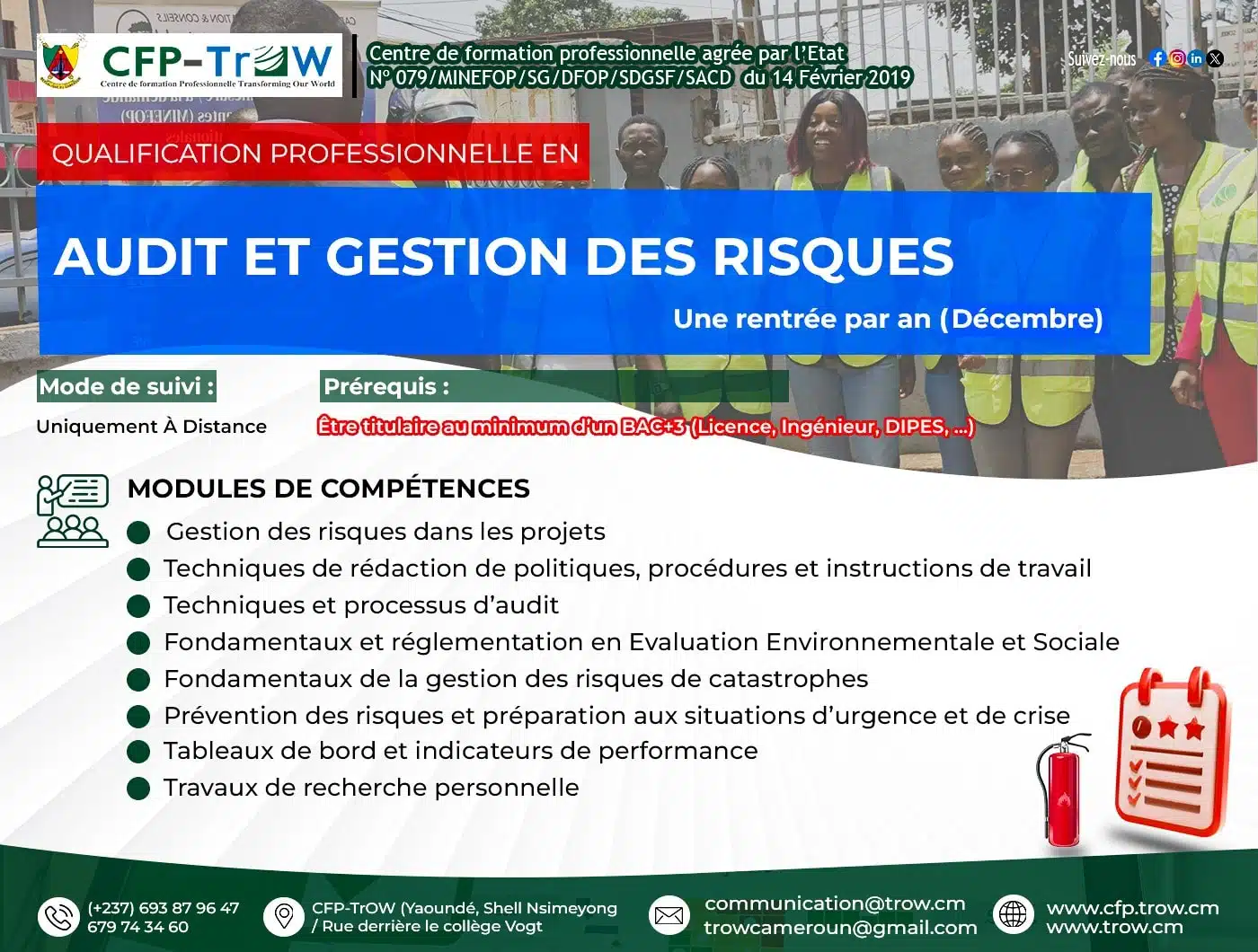 Au CFP-TrOW, nous mettons à votre disposition une formation professionnelle en Audit et Gestion des Risques. Elle aboutit à un Diplôme professionnel (CQP) délivré par le Ministère de l’Emploi et de la Formation Professionnelle du Cameroun.